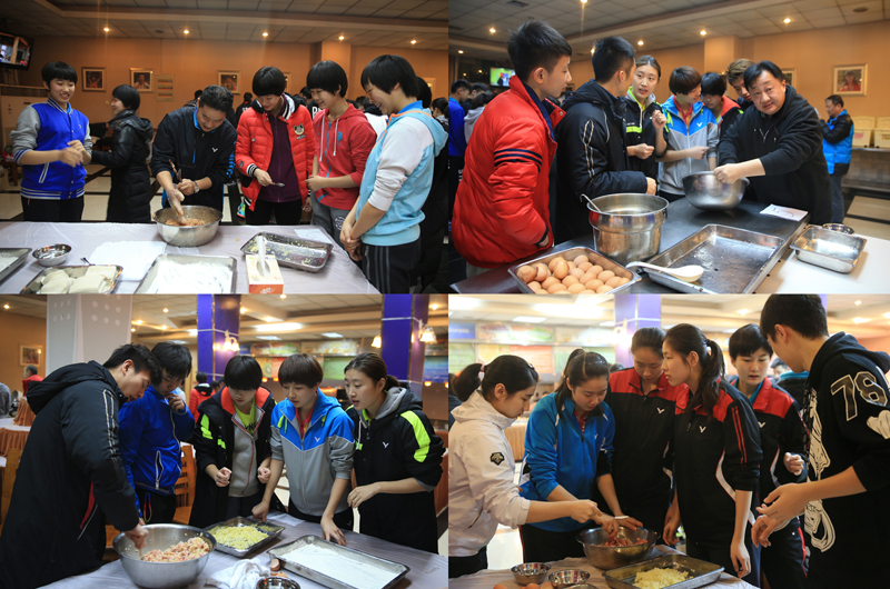 12月31日晚,羽毛球队迎新春厨艺大比拼活动在运动员食堂举行。训练处处长张健、羽毛球系系主任罗福亭、党委宣传部副部长许立俊、总务处副处长顾善全、运动康复医院副院长王家祥等部门领导和30余位羽毛球队队员及教练参加了本次活动。30余位羽毛球队队员分成4组参赛。由张健、许立俊、顾善全等5人组成的评委小组对4支参赛队伍端来的饺子从外形、口味等方面进行了评分,决出最佳外形、最美口味、最具创意三个奖项的一、二、三等奖。羽毛球系系主任罗福亭和威克多工作人员为获奖队伍颁奖。