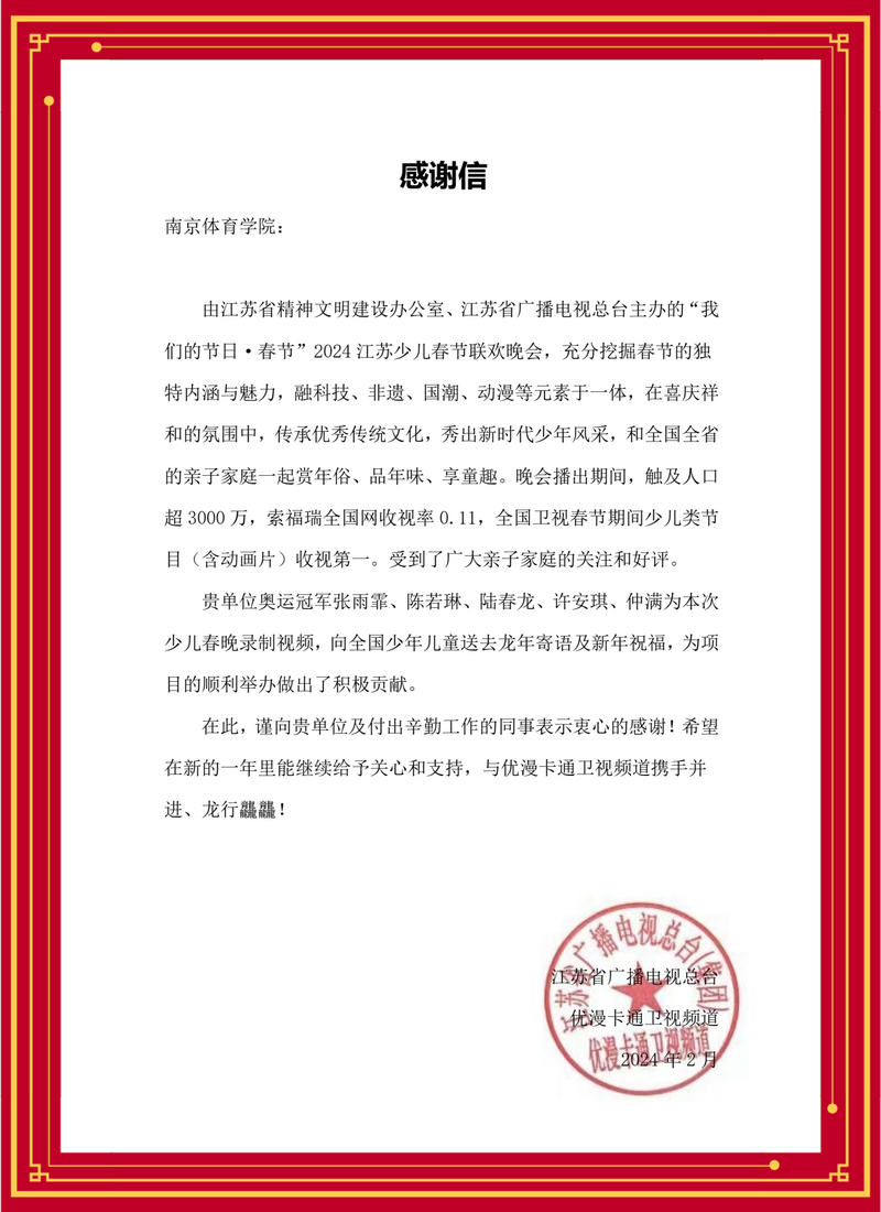 近日,江苏省广播电视总台向我校发来感谢信。信中表示,我校奥运冠军张雨霏、骆晓娟、许安琪、仲满、黄旭为2024江苏少儿春节联欢晚会录制视频,向全国少年儿童送去龙年寄语及新年祝福,为晚会的顺利举办做出了积极贡献。总台向我校及付出辛勤工作的同志表示衷心感谢,并希望新的一年里携手并进、龙行龘龘。