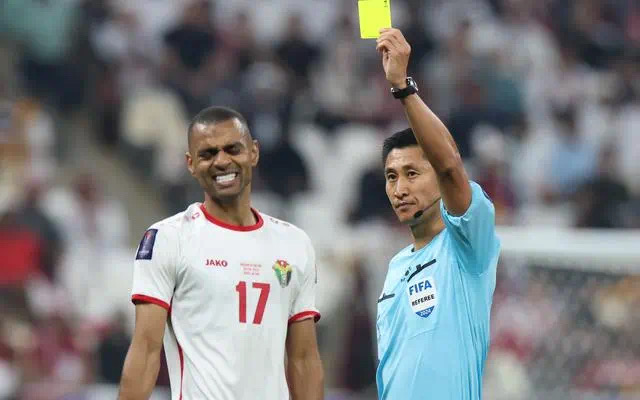 主裁判马宁(右)向约旦球员萨利姆·阿亚林出示黄牌。