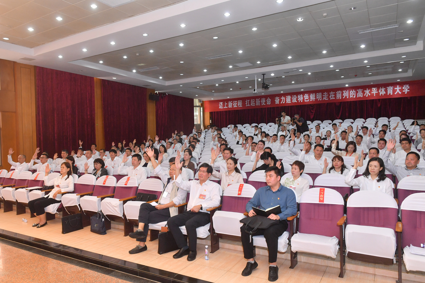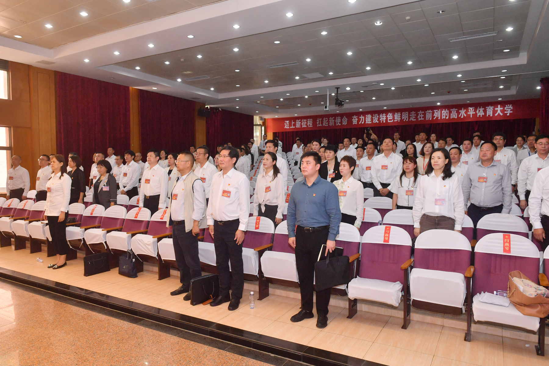 大会号召,全校各级党组织、广大共产党员和师生员工要在新一届党委领导下,紧密团结在以习近平同志为核心的党中央周围,不忘初心、牢记使命,迈上新征程,扛起新使命,埋头苦干、勇毅前行,为早日建成“特色鲜明、走在前列的高水平体育大学”不懈奋斗。