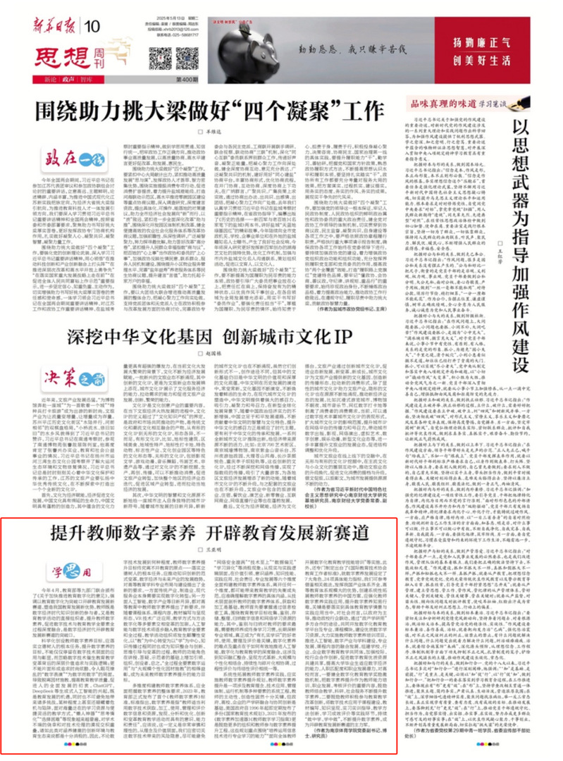 今年4月,教育部等九部门联合颁布了《关于加快推进教育数字化的意见》,强调以教育数字化为突破口开辟教育发展新赛道、塑造我国教育发展新优势。教师既是数字经济时代知识创新的参与者,又是教育教学活动的直接组织者。提升教师数字素养,促进数字技术与教育教学全要素全过程深度融合,是数字经济时代开辟教育发展新赛道的突破口。
