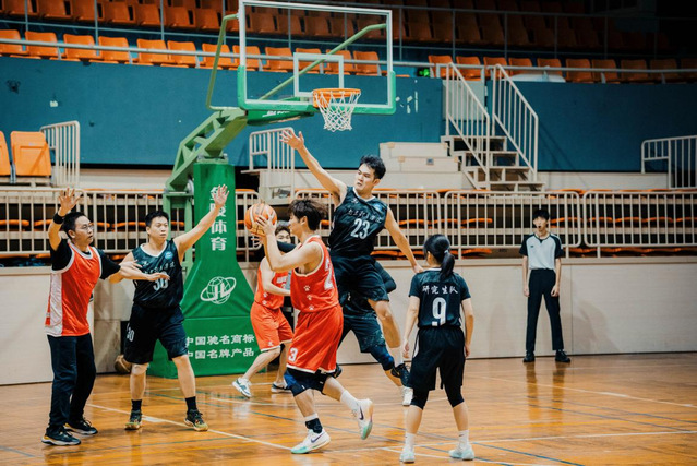 与此同时,仙林校区篮球馆内,体育教育与人文学院代表队与体育产业与休闲学院代表队率先展开首轮对决。得益于室内场馆的稳定环境,两队球员迅速进入状态,跑动、传球、投篮全程节奏明快。男子组赛事中,体教学院队伍凭借精准的外线投射与严密的内线防守掌控全局,全程保持比分压制,最终以70:53的比分拿下胜利;混合组赛场更显特色,体教学院队伍严格遵循联赛“至少 1 名女生在场”“含 1-2 名教职工”的规程,女生球员灵活穿插传导、积极卡位抢板,教职工球员则凭借丰富经验梳理攻防节奏,全队配合默契十足,最终以 67:36 战胜对手,与男子组一同为学院锁定“双线开门红”。场边观众席座无虚席,师生们的加油呐喊声此起彼伏,为赛场注入满满活力。