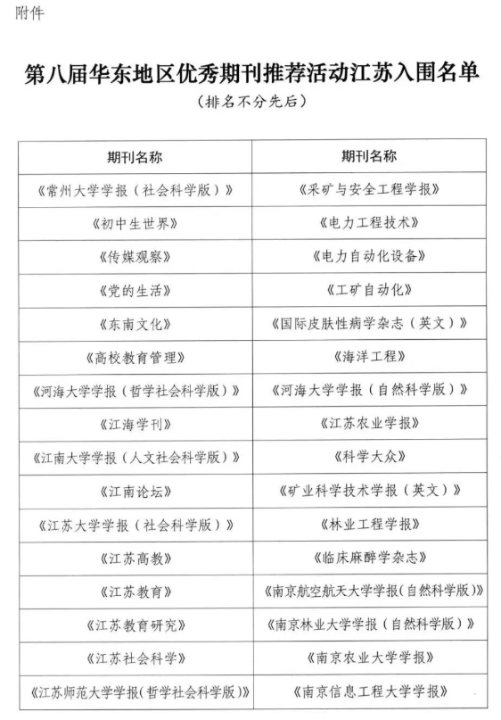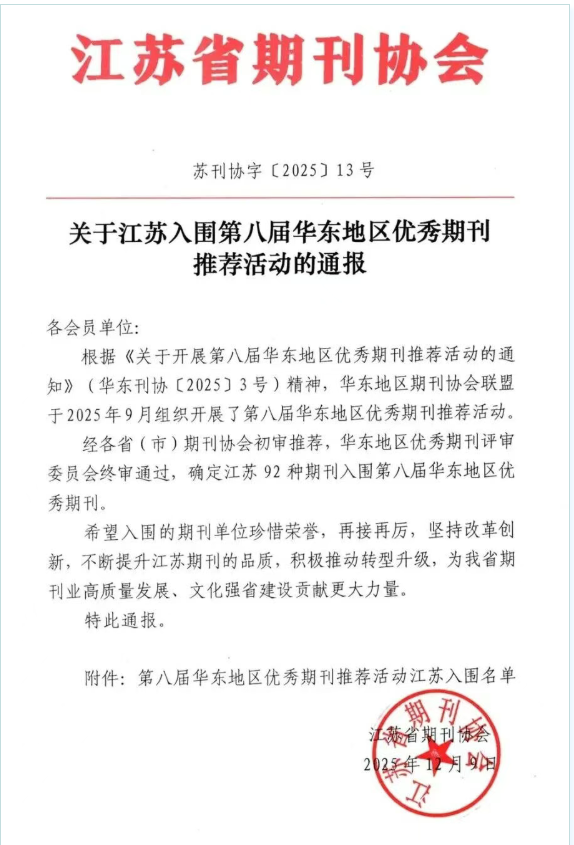 华东地区优秀期刊评选活动每四年举办一次,旨在表彰在学术质量、编辑规范、出版水平和影响力等方面表现突出的期刊,激励期刊出版单位提高出版质量,发挥优秀期刊的示范带动作用,促进我国期刊出版事业的繁荣与发展。本次评选经过各省(市)期刊协会初评推荐、华东地区优秀期刊评审委员会终评审议通过,最终确定入围名单。