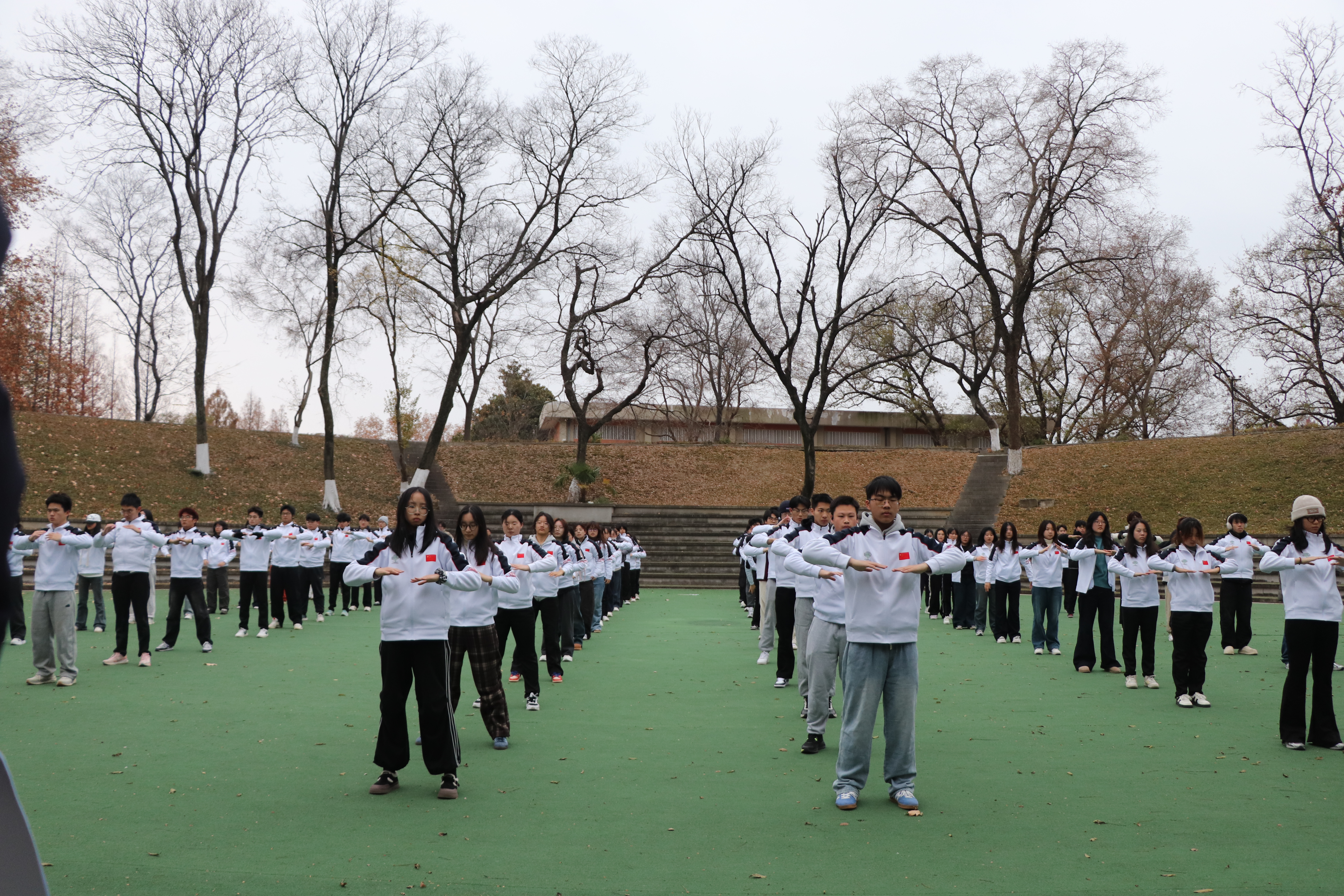 评比现场,各班学生精神抖擞、队列整齐。伴随着舒缓的音乐,学生们将八段锦“双手托天理三焦,左右开弓似射雕”等经典动作演绎得流畅自然。从预备式到收势,参赛学生动作舒展大方、呼吸协调,展现出扎实的训练基础和良好的身体素养。整个演示过程行云流水,充分体现了刚柔并济的中华传统健身气功特点。评审团认真观摩每个班级的展示,细致记录评分要点。