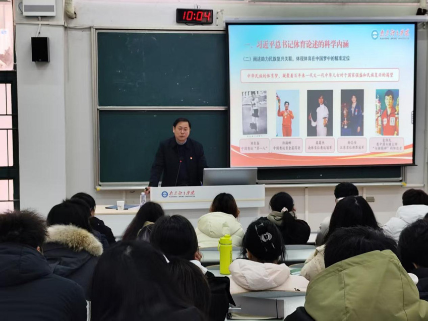 课上,吴兵成从三个方面进行讲授:一是深刻领会习近平总书记关于体育重要论述的科学内涵,牢牢把握与民族复兴中国梦紧密相连的精准定位;二是准确理解习近平总书记关于体育重要论述的历史贡献,宣传贯彻中国特色社会主义体育理论体系;三是准确理解习近平总书记关于体育重要论述的内在关联,切实担负起建设体育强国的历史使命。吴兵成指出,习近平总书记是从中华民族伟大复兴的战略高度出发,将体育事业融入国家发展全局。体育不仅是提高人民健康水平的重要途径,更是促进人的全面发展、凝聚民族精神、展现国家形象的重要载体。吴校长结合我国体育事业发展历程,特别是新时代以来竞技体育屡创佳绩、群众体育蓬勃开展、体育产业活力迸发的生动实践,深入解读了体育在服务国家战略、助推社会进步、丰富人民生活中不可替代的作用。