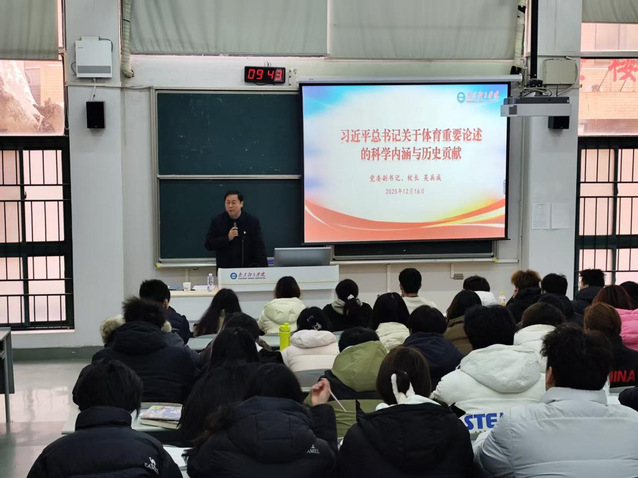 为深入贯彻落实习近平总书记对学校思政课建设的重要指示精神,将党的教育方针转化为生动育人实践,持续巩固思政课作为立德树人关键课程的铸魂育人阵地作用。12月16日上午,校党委副书记、校长吴兵成走进思政课堂,以“习近平总书记关于体育重要论述的科学内涵与历史贡献”为主题,为2025级运动人体科学、武术与民族传统体育专业学生讲授了一堂兼具思想高度、理论深度与育人温度的专题思政课。