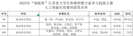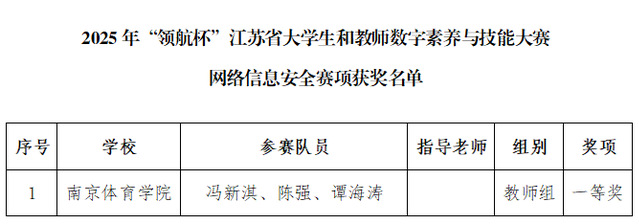 近日,2025年“领航杯”江苏省数字素养系列比赛结果揭晓。我校师生积极参赛,表现出色:在人工智能应用赛项获得特等奖1项、二等奖2项;在“教师数字素养提升实践活动”中斩获高等教育组特等奖1项,一等奖1项;在“大学生和教师数字素养与技能大赛网络信息安全赛”中,荣获教师组一等奖1项,充分展现了我校师生扎实的数字素养与创新实践水平。
