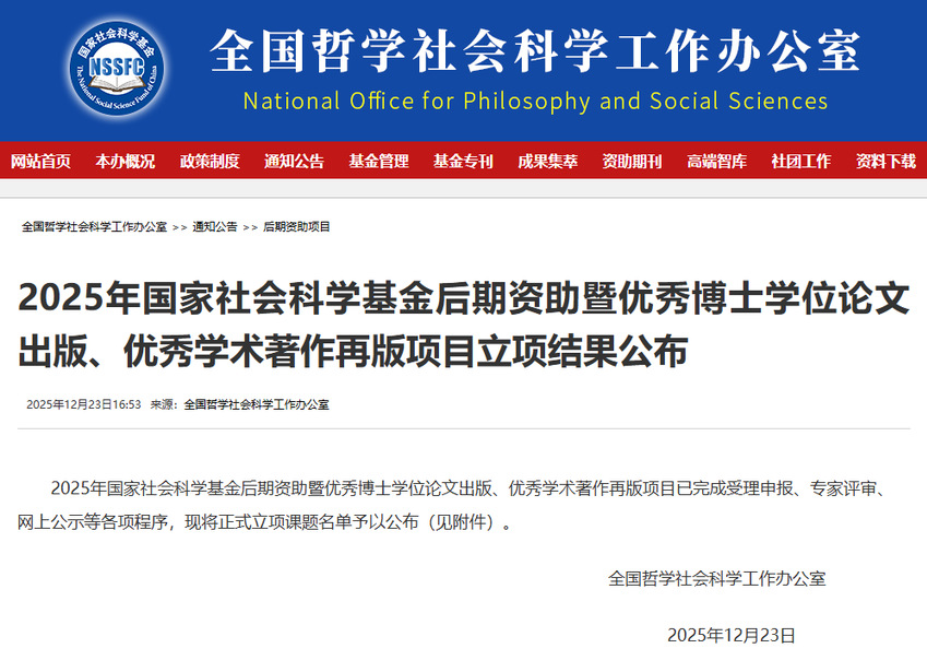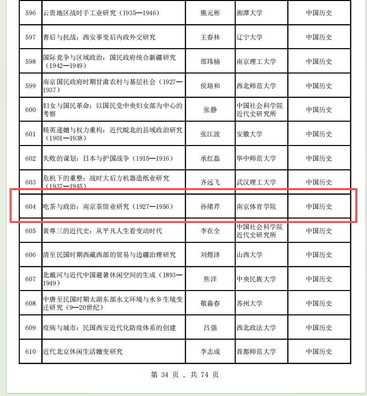 近日,全国哲学社会科学工作办公室公布了2025年国家社会科学基金后期资助暨优秀博士学位论文出版、优秀学术著作再版项目立项名单。我校体育产业与休闲学院孙绪芹副教授的研究成果《吃茶与政治:南京茶馆业研究(1927-1956)》成功获得立项。这是我校哲学社会科学领域取得的一项标志性成果。