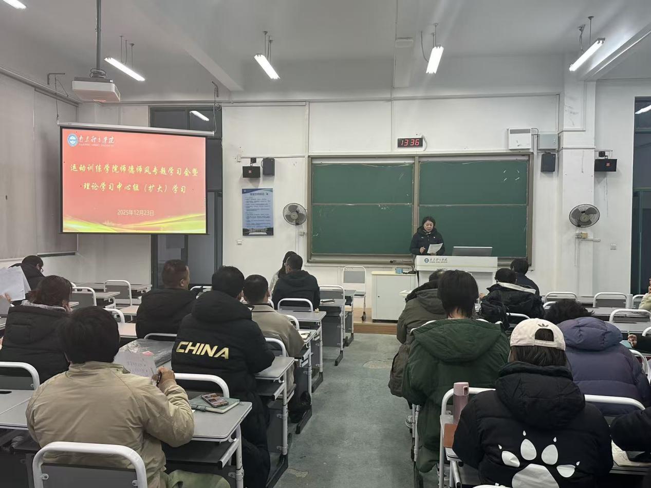 12月23日,运动训练学院师德师风专题学习会暨理论学习中心组(扩大)学习会在C301教室召开,学院领导班子成员及全体教师参会,会议由院党总支书记葛见珠主持。