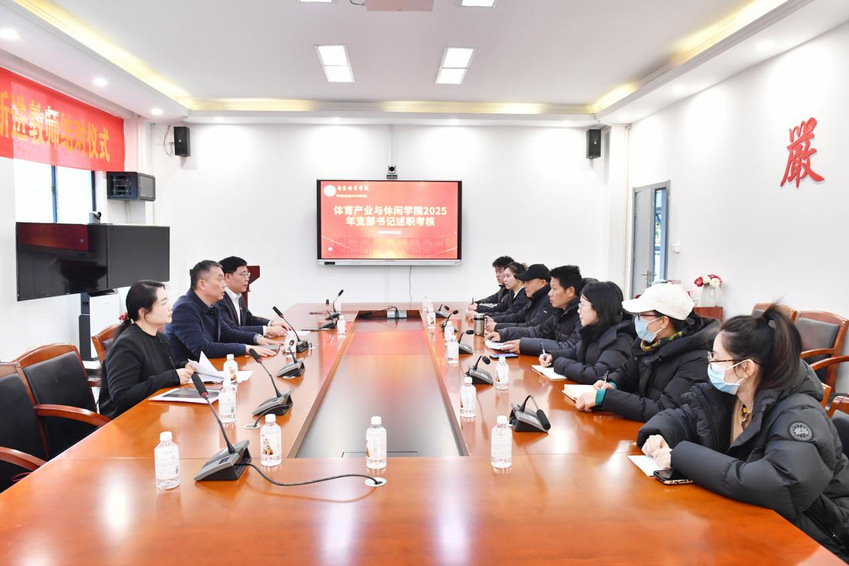 12月23日中午,体育产业与休闲学院党总支在missav仙林校区A105会议室成功组织召开2025年度党支部书记抓党建工作述职评议会。体育经济与管理系党支部书记张建明、社会体育指导与管理系党支部书记曹全军、休闲体育系党支部书记朱金宁以及学生党支部书记王珺君依次进行了现场述职,全面展示了各自的履职情况。随后,学院党总支书记王进对述职情况进行了集中点评,并对2026年的党建工作做出了具体部署。