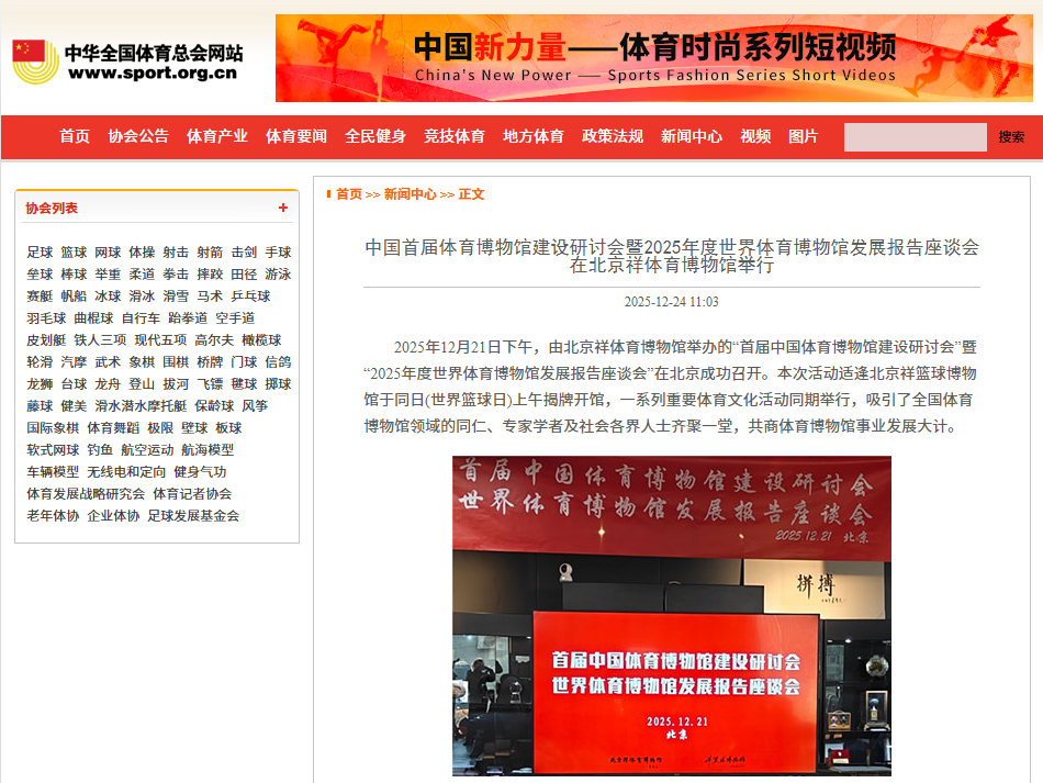 本次会议汇聚了北京奥运博物馆、陕西省体育博物馆、天津体育博物馆、上海体育博物馆、安徽体育博物馆、重庆体育博物馆、广东体育博物馆、四川省体育博物馆等全国十余家重要体育类博物馆负责人,以及北京大学、北京体育大学、上海体育大学、成都体育学院等多所高校的相关负责人、专家学者。北京祥体育博物馆馆长、中国收藏家协会副理事长李祥在会上作了主题报告,并发布了《2025世界体育博物馆发展报告》。与会代表围绕体育文化传承、展陈创新、藏品积累等议题展开深入研讨,形成了强化研究支撑、推动科技赋能、深化馆际合作等共识。