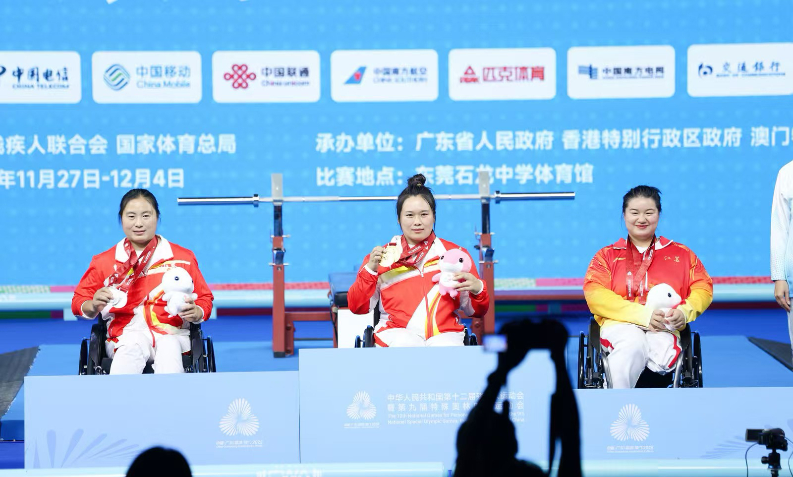孙新园(右一)荣获全国第十二届残疾人运动会暨第九届特殊奥林匹克运动会举重女子67公斤级最佳重量和总重量铜牌