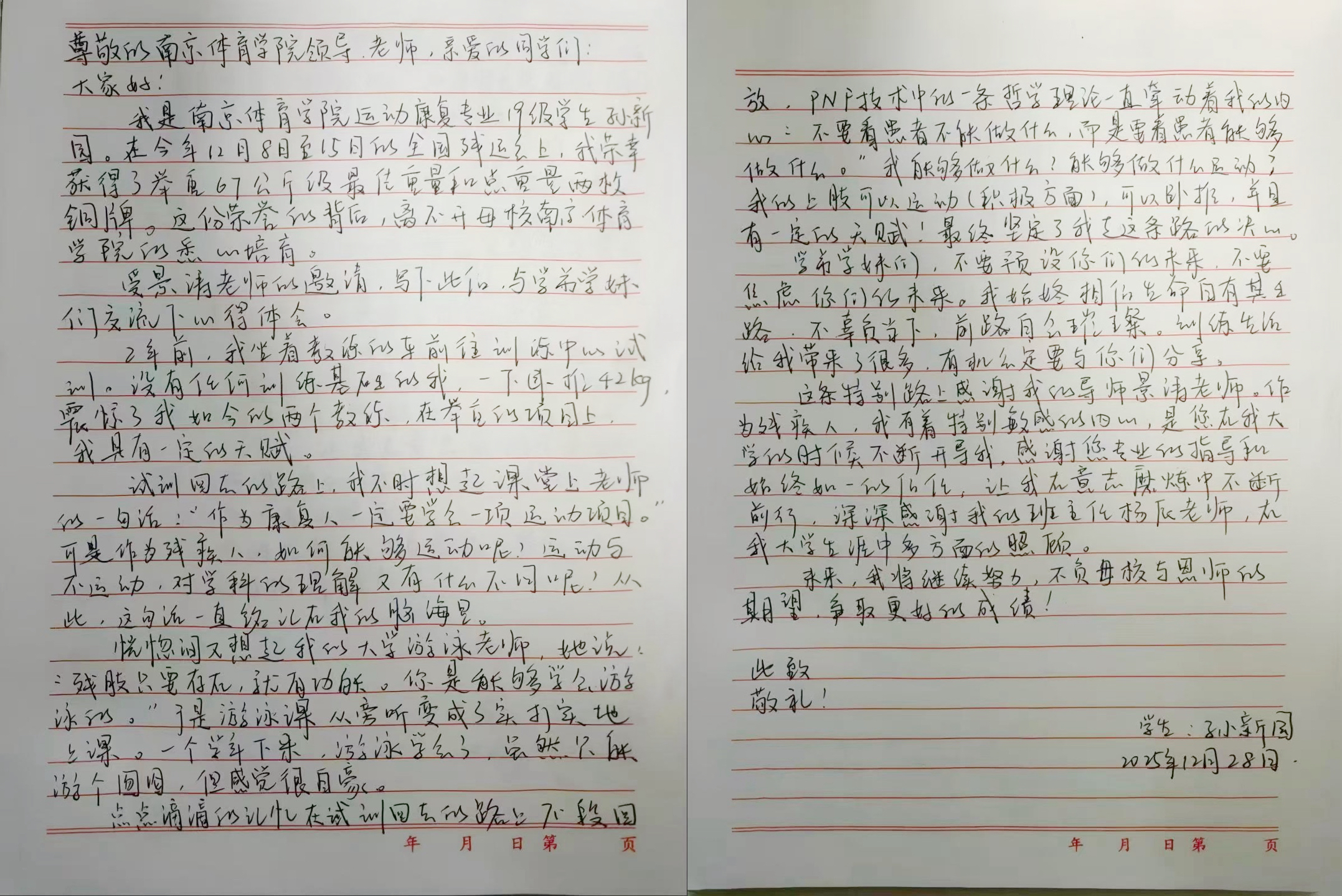 2026年新年第一天,运动健康学院全体学子收到了一份特殊的新年礼物——全国第十二届残疾人运动会暨第九届特殊奥林匹克运动会举重比赛两枚铜牌获得者、我院19级运动康复专业校友孙新园的亲笔来信。信中,她回望从课堂到赛场、从学子到运动员的蜕变征程,用奋斗故事送上新年祝福,更以亲身经历为学弟学妹们注入逐梦力量。