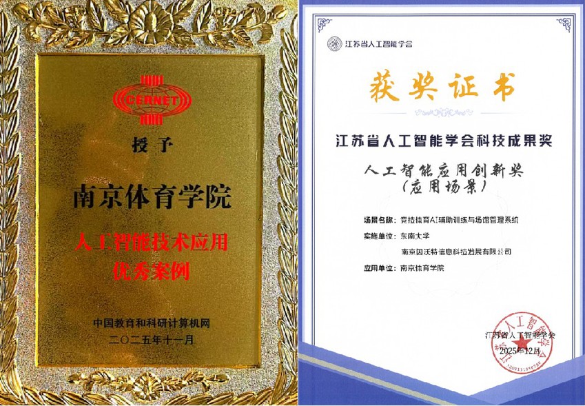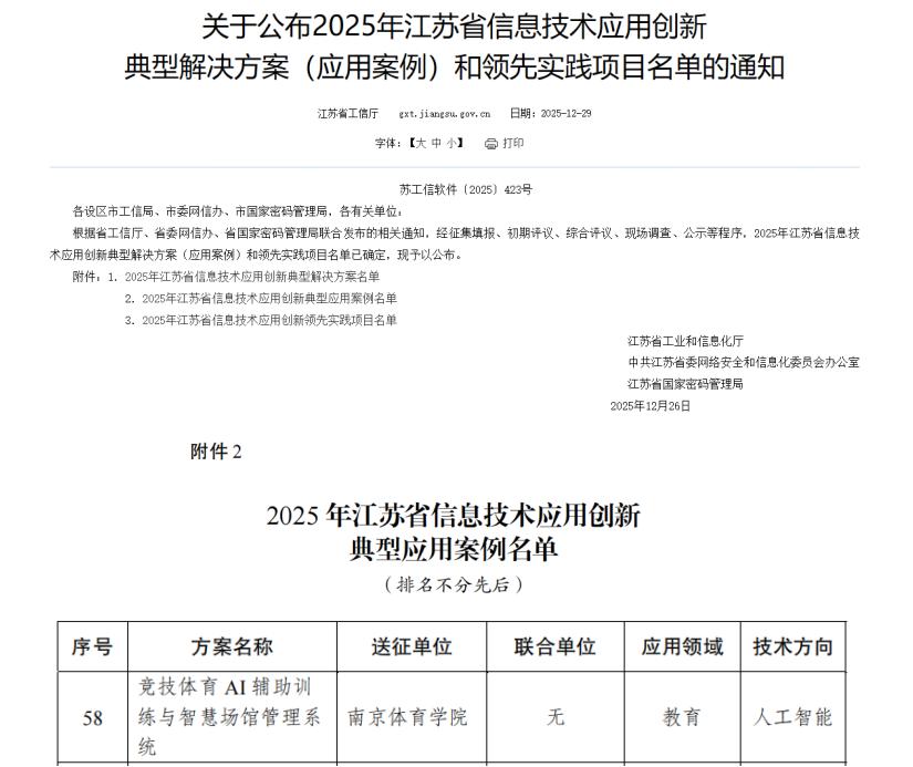近日,江苏省工业和信息化厅公布了2025年江苏省信息技术应用创新典型解决方案(应用案例)及领先实践项目名单。我校信息化建设案例《竞技体育AI辅助训练与智慧场馆管理系统》成功入选典型应用案例名单。此外,该案例亦先后荣获中国教育和科研计算机网2025年江苏省教育行业人工智能技术应用优秀案例,以及江苏省人工智能学会2025年人工智能应用创新奖(应用场景类)。