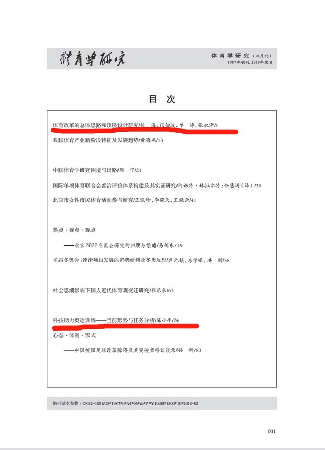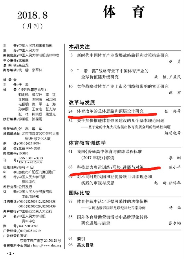 近日,通过查询《人大复印报刊资料全文数据库》获悉,我校《体育学研究》2018年第一期刊发的任海教授和陈小平教授两篇论文被《人大复印报刊资料˙体育》2018年第八期同期转载。这是自本刊创刊以来首次同期刊文有2篇被转载,这在体育类期刊中也实属罕见。