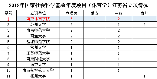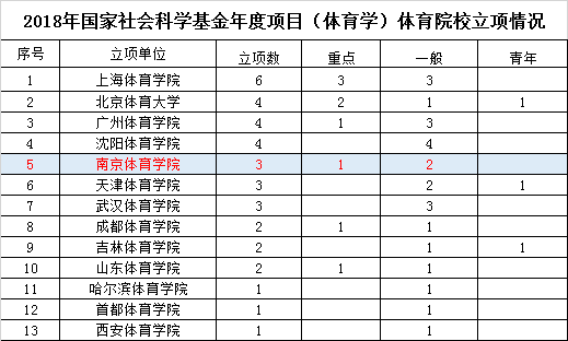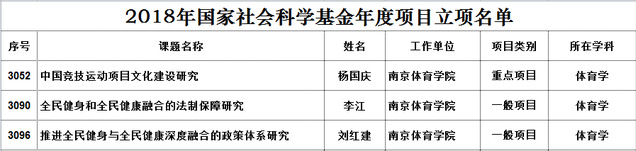 近日,全国哲学社会科学规划办公室正式公布了2018 年度国家社科基金年度项目立项课题名单,我校杨国庆校长申报的《中国竞技运动项目文化建设研究》获得重点项目立项,李江副校长申报的《全民健身和全民健康融合的法制保障研究》和体育系刘红建副教授申报的《推进全民健身与全民健康深度融合的政策体系研究》获得一般项目立项。立项总数超过2017年,在全国体育院校中位列第5,江苏省内位列第1,同时还实现了重点项目立项的新突破。