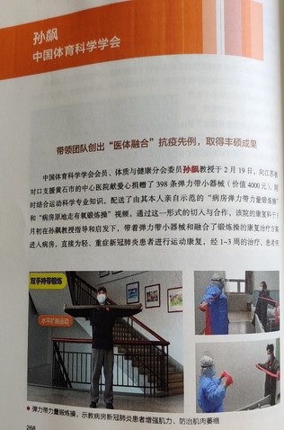 疫情期间,孙飙教授向江苏省对口支援黄石市的中心医院捐赠医疗器械,同时结合运动科学专业知识,配送了由其本人示范的“病房弹力带力量锻炼操”和“病房原地走有氧锻炼操”视频。孙飙教授领衔的“运动干预与健康促进”学科团队,其主要成员有运动健康学院的副院长赵彦、运动康复系主任戴剑松、运动康复系副主任顾忠科、康复治疗学系主任吕远远、运动人体科学系主任白宝丰、运动人体科学系副教授徐凯等,关注广大慢性疾病人群疫期居家锻炼缺乏指导的“痛点”,经过加班加点的居家生活方式问卷调查、撰稿写作和视频制作,于3月6日完成了由人民体育出版社出版的《慢病人群居家锻炼指南》。基于抗疫实践和经验,孙飙教授还申报了国家社科类专项基金课题《基于“医体融合”视野下,科学运动在应对重大突发公共卫生事件中的保障与协同机制研究》。