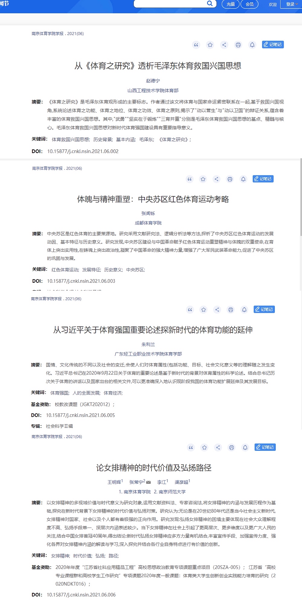 编辑部在该栏目中精心组织了8篇专题文章,其中既有追溯中华体育精神源头的《从<体育之研究>透析毛泽东体育救国兴国思想》《魂魄与精神重塑:中央苏区红色体育考略》,又有《从习近平关于体育重要论述探新时代体育功能的延伸》,更有以现役中国女排主力队员张常宁为通信作者撰写的《论女排精神的时代价值与弘扬路径》。8篇作品作者分别从不同视角对中华体育精神进行了溯源与理论梳理。8篇文章经过编辑部成员的精心组织策划与认真编校,现已呈现在中国知网《missav学报》特定页面,供广大读者阅读与下载。