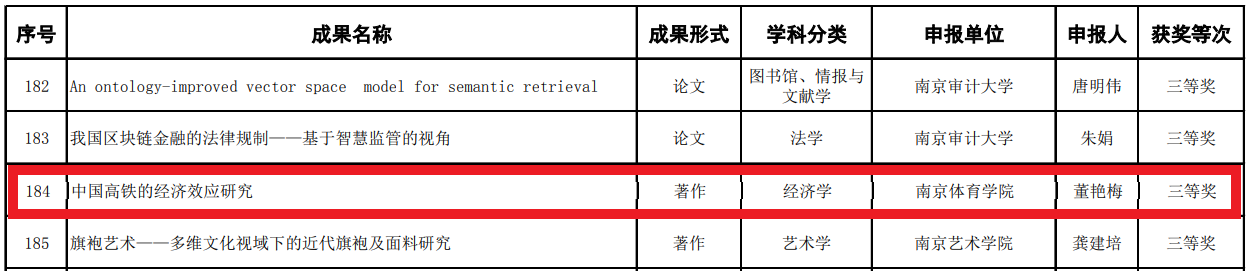 日前,省教育厅公布了2021年江苏省高等学校哲学社会科学研究成果奖的评审结果,我校彭国强老师的论文《世界竞技体育强国备战奥运政策及对我国备战东京奥运会的启示》荣获一等奖。这是全省体育学学科唯一的一等奖,同时也实现了我校哲学社会科学领域的重大突破。此外,我校董艳梅老师的著作《中国高铁的经济效应研究》荣获三等奖。