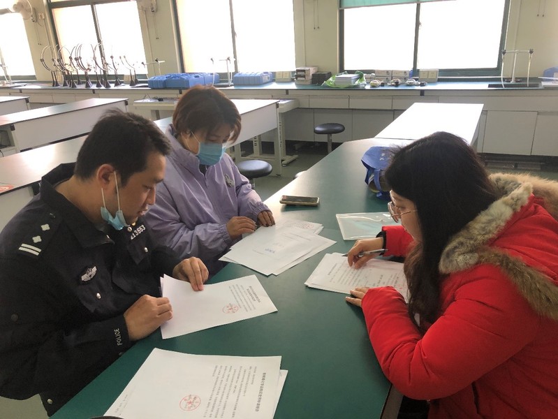 2月25日上午,玄武区公安局禁毒大队朱俊警官一行来我校实验室现场检查考核易制毒危险化学品管理工作。朱警官一行分别检查了我校危化品仓库、生化实验室,并对我校易制毒危险化学品购置申请材料进行审核。