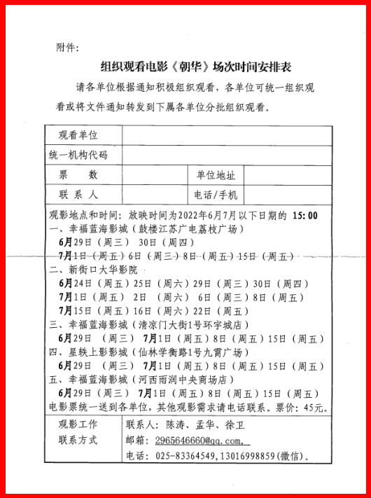 附件:组织观看电影《朝华》场次时间安排表