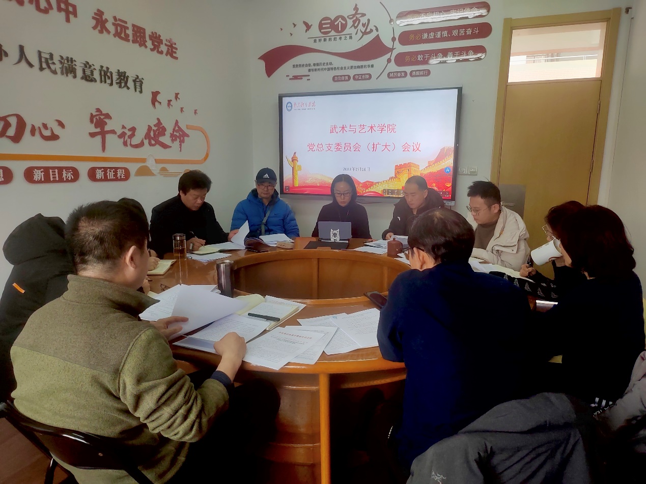 为进一步加强党的建设,贯彻落实全面从严治党主体责任,部署新学期党建工作,2月16日下午,武术与艺术学院党总支在教学实验楼二号楼308会议室召开总支委员会(扩大)会议,研究部署2023年度党建工作。学院党总支委员及各党支部书记参加会议。会议由学院党总支书记张亚军主持。