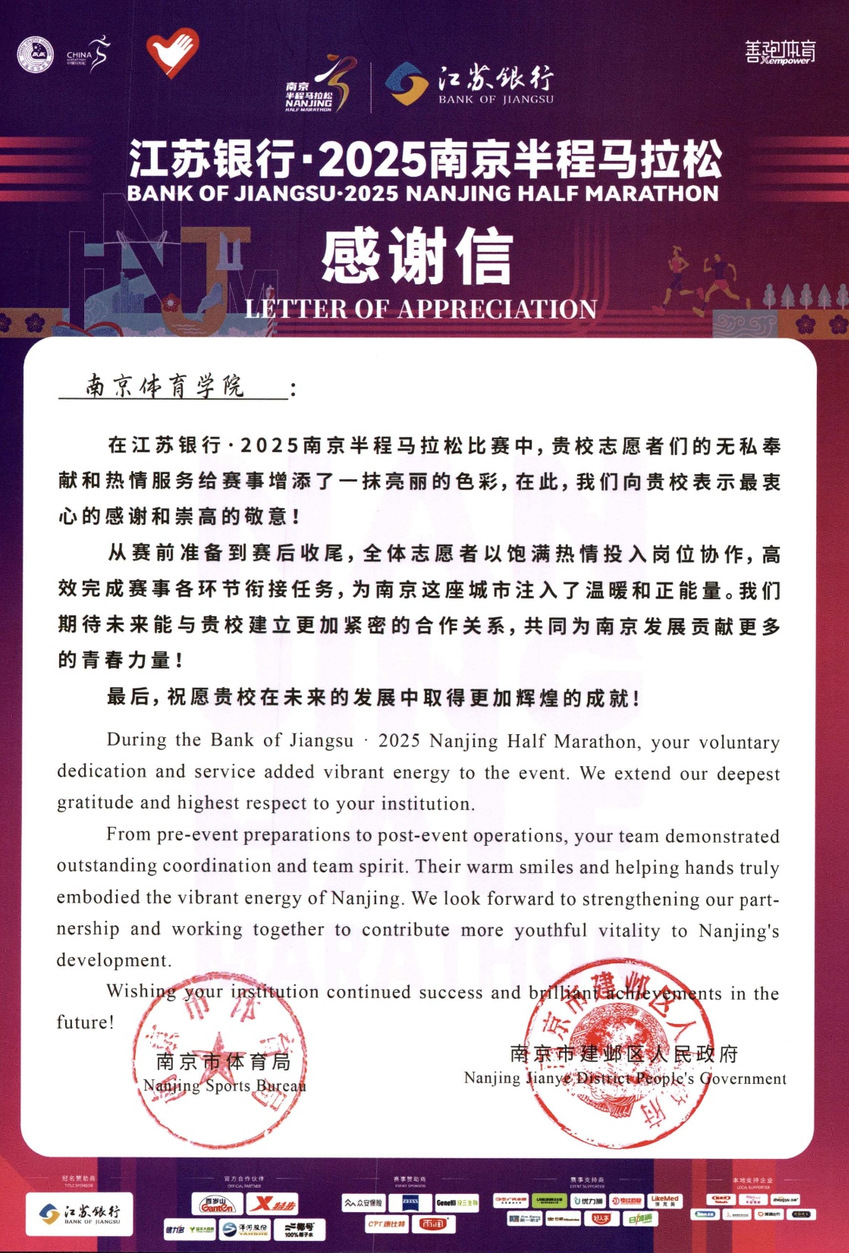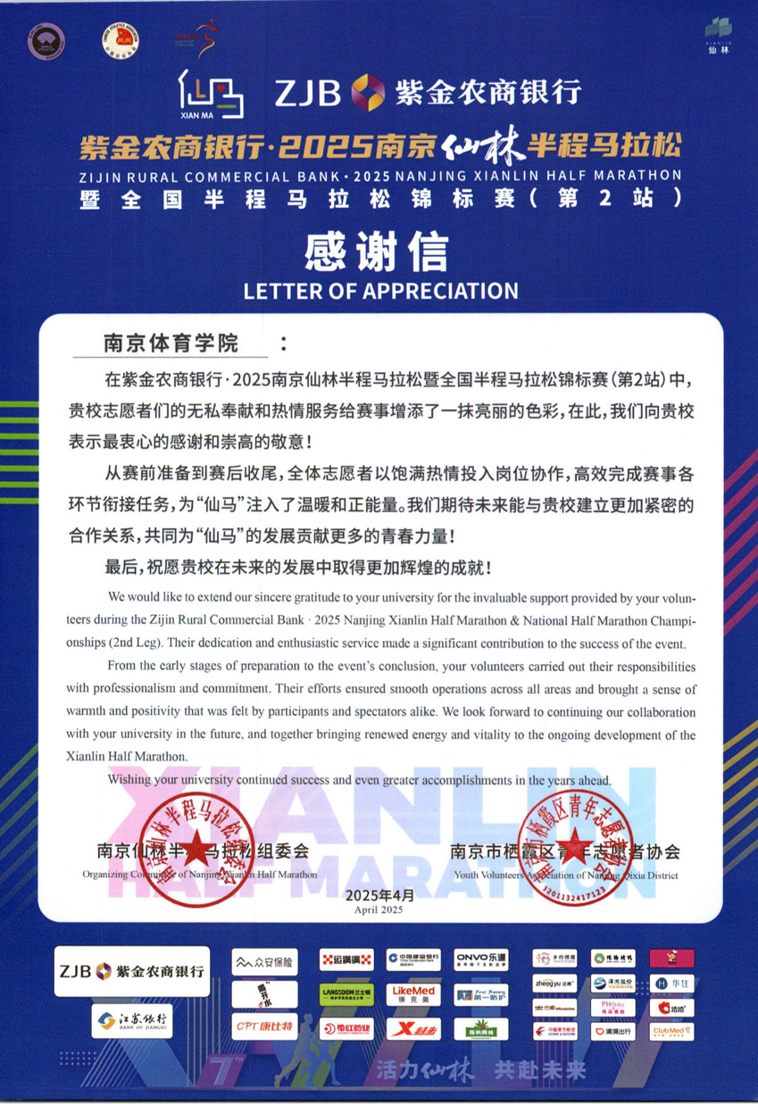 近日,南京半程马拉松、南京仙林半程马拉松组委会向我校发来感谢信,感谢missav志愿者在2025年对南京半程马拉松、南京仙林半程马拉松比赛工作的支持与助力。