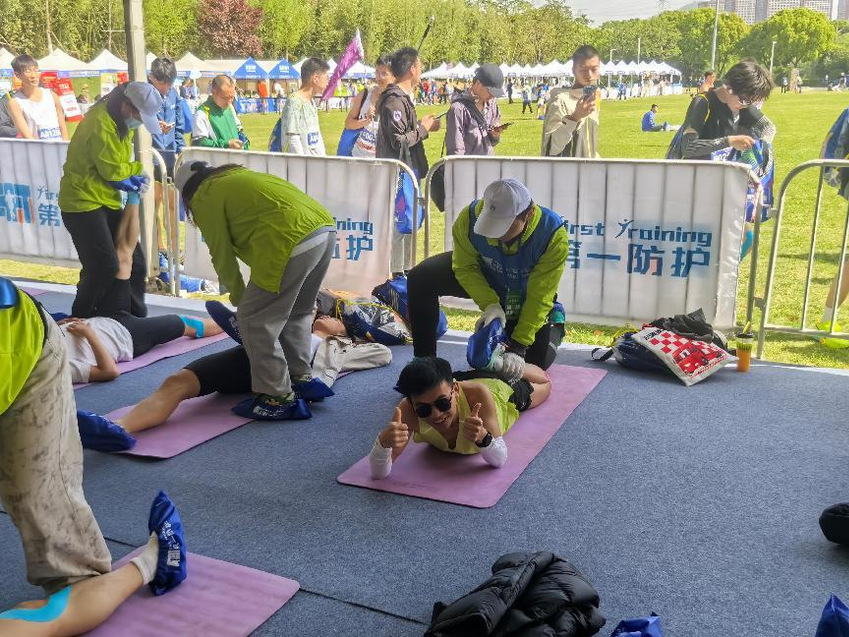 我校志愿者帮助完赛选手拉伸