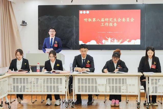 分组讨论环节,学代会代表在第一报告厅聚焦学生工作核心议题,围绕学风建设、体教融合、数字化服务等展开深入研讨,针对发展瓶颈提出建设性解决方案;研代会代表在第二报告厅围绕研究生培养质量提升、科研创新支持、学术交流拓展等关键环节,探索优化路径与提升策略。六个代表团的代表们严格按照程序审议各项文件,认真行使民主权利,规范完成投票表决,充分展现了求真务实的议事作风和高度的责任感。