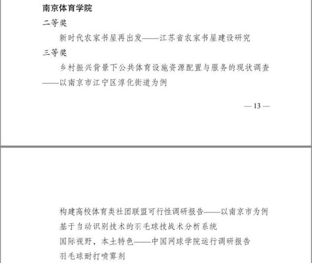 近日,第十六届江苏省大学生课外学术科技作品竞赛暨“挑战杯”全国竞赛江苏省选拔赛决赛结果揭晓,我校《新时代农家书屋再出发——江苏省农家书屋建设研究”》获得二等奖(指导教师:王凯 参赛学生:毛伟 袁萍萍 陈岳梅 姜亚南 陆金宇 刘馨磊 尹钰潼 熊玮),《乡村振兴背景下公共体育设施资源配置与服务的现状调查 ——以南京市江宁区淳化街道为例》(指导教师:沈鹤军 参赛学生:沈璇 陈叙 林宇 吕邵睿 刘露 吴桐 邵传雯)《构建高校体育类社团联盟可行性调研报告——以南京市为例》(指导教师:刘健 包静 参赛学生:朱凯 孙驰宇 张然 卢瀚林 陆启康 程琬悦 刘子濠 周梓熙 赵临风 李文依)《基于自动识别技术的羽毛球技战术分析系统》(指导教师:李江:参赛学生:陆迪森)、《国际视野,本土特色——中国网球学院运行调研报告》(指导教师:陈荣梅 王猛 王凯 参赛学生:崔希 徐慧 朱静 郑嘉皓 郑誉 南方雪 林奕彤 王义泉)以及《羽毛球耐打喷雾剂》(指导教师:宋雅伟 参赛学生:王宇笛 王雁娇 刘欣昊 白荣雁 周子钰 池晴可)获得三等奖。