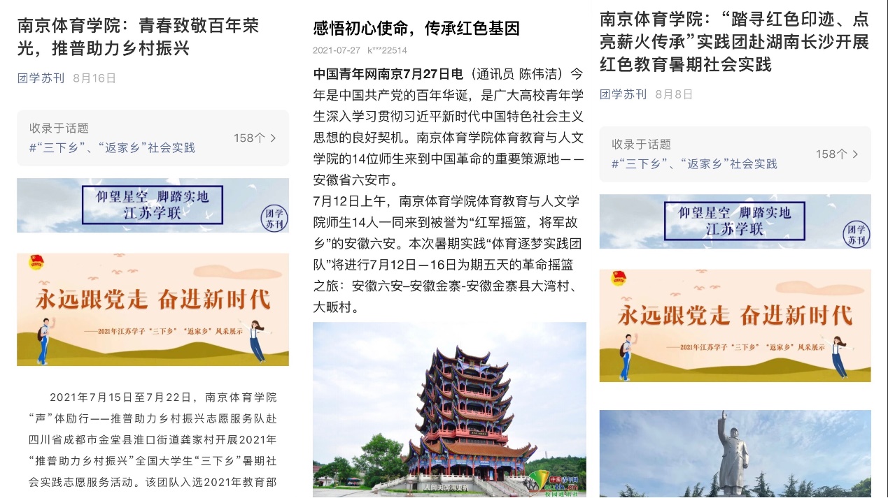 因受疫情特殊情况的影响,今年“三下乡”暑期社会实践仍坚持“安全第一、就近就便”原则,同时加强线下与线上相结合,开展实践活动。在活动过程中,我校青年学生深入基层农村、红色景点、学校、街道社区等,开展党史学习、理论宣讲、社会调研等一系列活动,并且形成多篇社会实践调研报告,受到了中国青年网、团学苏刊、江苏教育频道、南京电视台教科频道、沭阳县电视台等多个各级各类新闻媒体的关注与报道。