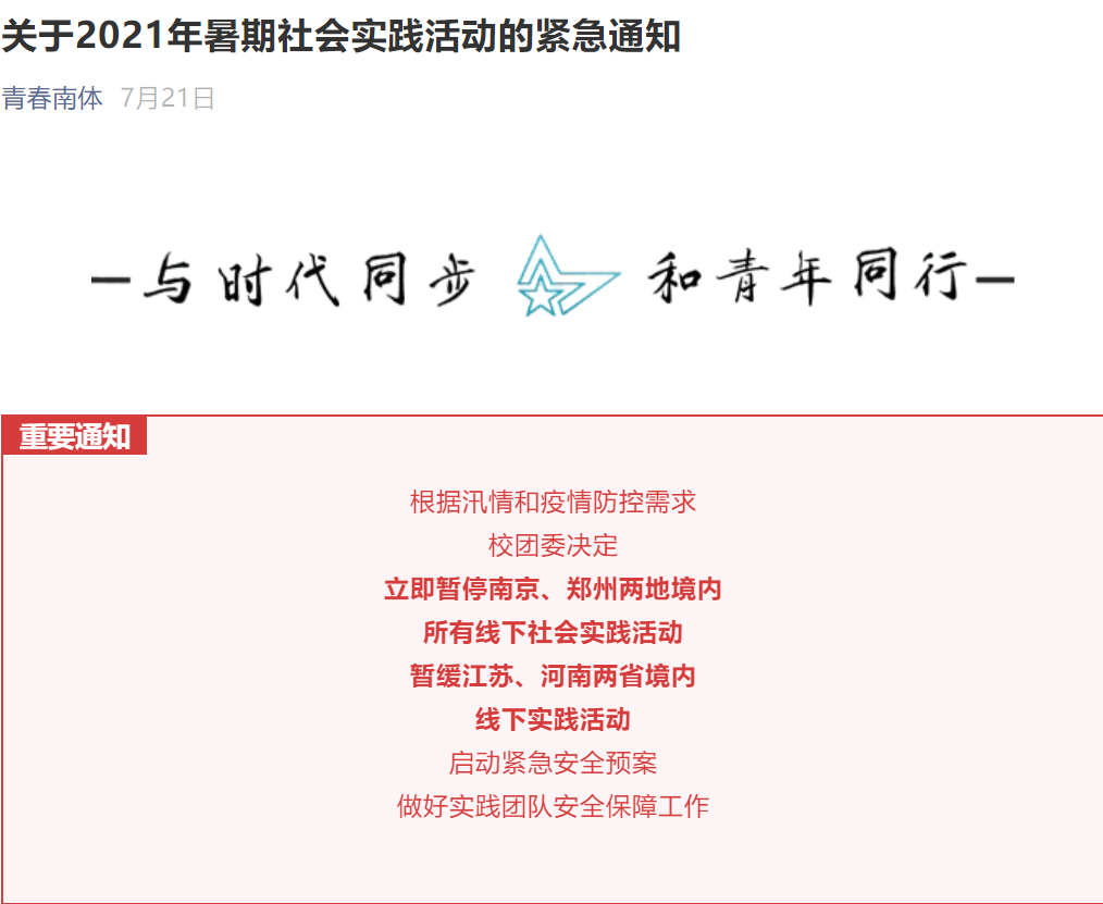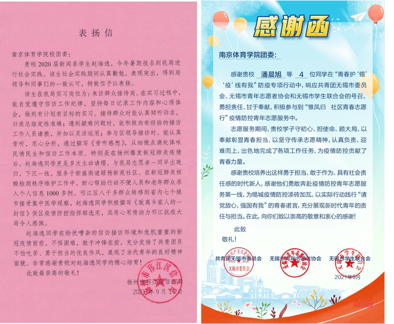 7月,南京疫情突如其来的反扑打乱了很多人的生活节奏,为坚决打赢疫情防控阻击战,共同守护美丽南京,校团委迅速行动,落实省委、团中央有关工作要求,第一时间发布《关于2021年暑期社会实践活动的紧急通知》,引领广大青年学生在投身战“疫”和“三下乡”“返家乡”社会实践中深刻了解国情,关注时代发展,厚植家国情怀,积极践行“请党放心,强国有我”的青春誓言,在此次疫情防控中,我校共178名志愿者与工作人员携手守护“城”安,志愿服务时长约11816小时,得到了服务所在地区政府和居民的赞扬和认可,其中扬州市邗江区信访局、无锡市团委向我校团委发来感谢函与表扬信。