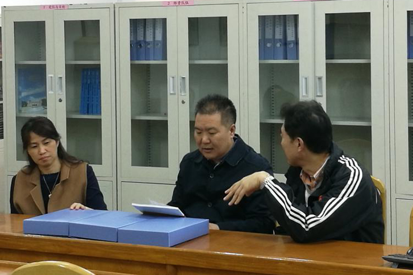 严海平处长向朱传耿书记一行汇报自评报告支撑材料整理情况