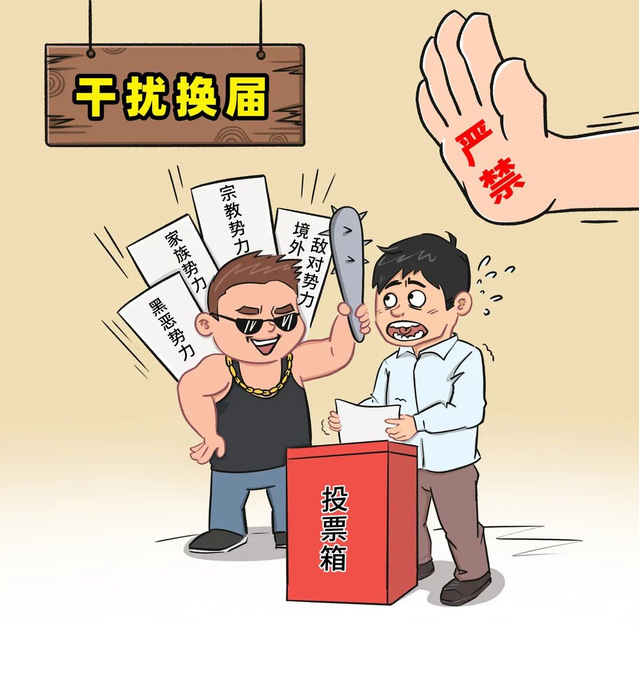 对境内外敌对势力搅扰破坏换届的,严加防范、坚决打击;对黑恶势力、家族势力、宗教势力干扰影响换届选举的,违规接受境外机构、组织、个人提供资助或者培训的,以威胁、欺骗、利诱等手段妨害他人自由行使选举权的,造谣诽谤、诬告陷害或者打击报复他人的,一律严厉查处,涉嫌违法犯罪的依法追究法律责任。