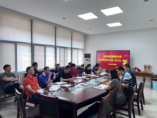 9月2日上午,击剑学院直属党支部在击剑馆一楼会议室召开理论学习中心组(扩大)学习会。会议由学院直属党支部书记朱小兰主持,全体管理干部、教练员参加学习。