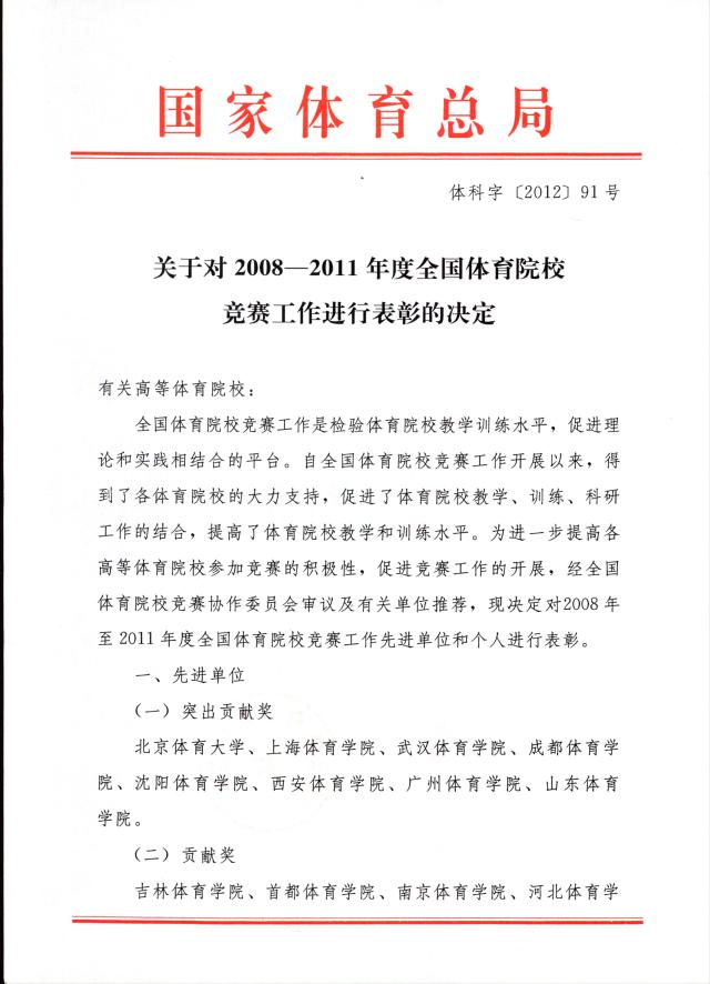 近日,国家体育总局为进一步提高各高等体育院校参加竞赛的积极性,促进竞赛工作的开展,决定对2008-2011年度全国体育院校竞赛工作先进单位和个人进行表彰。