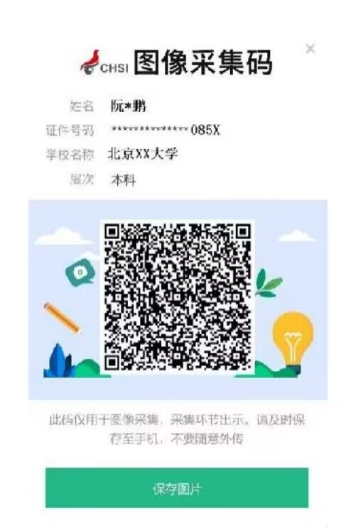 2.各学院通知学生提前登录学信网,进入“学信档案-高等教育信息-学籍-查看图像采集码”页面,获取由学信网为每个学生提供的专属加密的二维码(简称采集码,见图1),采集码中包含学生唯一编号、姓名、证件号码等毕业生图像采集所需的必要信息,其中姓名和证件号码进行脱敏处理。学生在登录“江苏图采”小程序时,小程序会对采集码进行识别解密,将合格的电子图像和采集码中的信息通过安全通道传输到学信网,精准链接到学生的学籍注册信息。