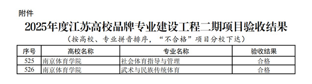 近日,江苏省教育厅公布了2025年度江苏高校品牌专业建设工程二期项目验收结果,我校2022年立项的第三批省级品牌专业武术与民族传统体育、社会体育指导与管理2个专业顺利通过验收。