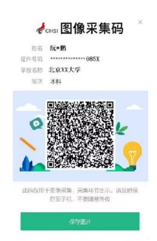 2.各学院要通知学生提前登录学信网,进入“学信档案-高等教育信息-学籍-查看图像采集码”页面,获取由学信网为每个学生提供的专属加密的二维码(简称采集码,见图1),采集码中包含学生唯一编号、姓名、证件号码等毕业生图像采集所需的必要信息,其中姓名和证件号码进行脱敏处理。学生在登录“江苏图采”小程序时,小程序会对采集码进行识别解密,将合格的电子图像和采集码中的信息通过安全通道传输到学信网,精准链接到学生的学籍注册信息。