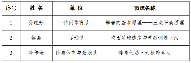 根据《关于做好江苏省本科院校青年体育教师微课比赛选拔工作的通知》相关要求,在教学单位推荐基础上,教务处组织专家对报名参赛的7名教师的参赛作品予以评审,经专家评选,拟推荐孙艳芳、解鑫、冷传奇3名教师代表我校参赛。现对选拔结果予以公示,公示时间为2018年6月28日-6月30日。如对评选结果有异议,请在公示期内向教务处反映。