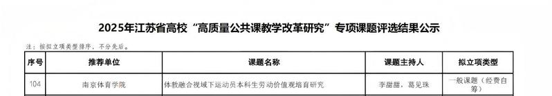 近日,江苏省高等教育学会先后发布《关于公布2025年江苏本科高校“人工智能通识课程、基础课程教学改革研究”专项课题评选结果的通知》(苏高教会〔2025〕29号)、《关于公布2025年江苏省高校“高质量公共课教学改革研究”专项课题评选结果的通知》(苏高教会〔2025〕43号),我校周晶老师主持的“基于AI赋能的《智慧体育概论》课程模块化构建研究”和李甜甜、葛见珠主持的“体教融合视域下运动员本科生劳动价值观培育研究”获批立项。
