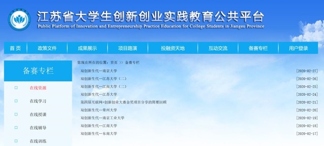 3.强化培训。备赛团队,积极利用江苏省高校创新创业教育工作委员会开设的“江苏省大学生创新创业实践教育公共平台”(网址:http://180.108.46.32:83/26/list.html)“备赛专栏里”中相关教学资源,包括大赛政策解读、往届省赛和国赛视频、专家讲座、基础知识学习、在线辅导等,开展相关学习,掌握竞赛基本知识和参赛技巧。(资源持续更新中)