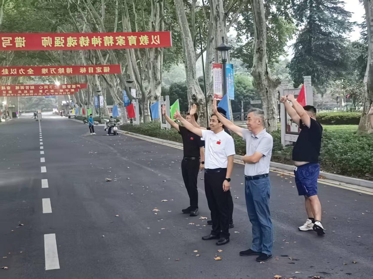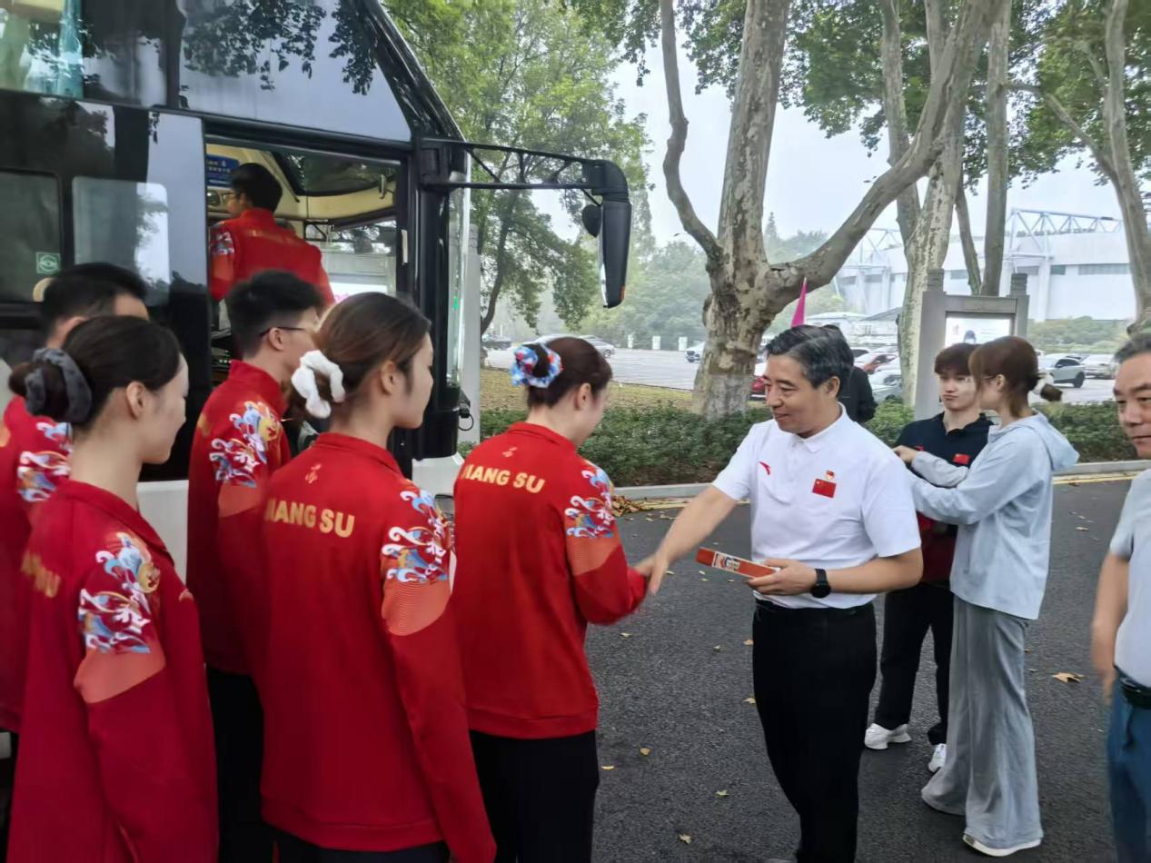 在庄重而热烈的氛围中,校党委书记刘红明向蹦床队发布出征令,并与全体出征人员一一握手送别,送上寓意“旗开得胜、马到成功”的“定胜糕”,表达了全校师生员工对蹦床队的殷切期望。
