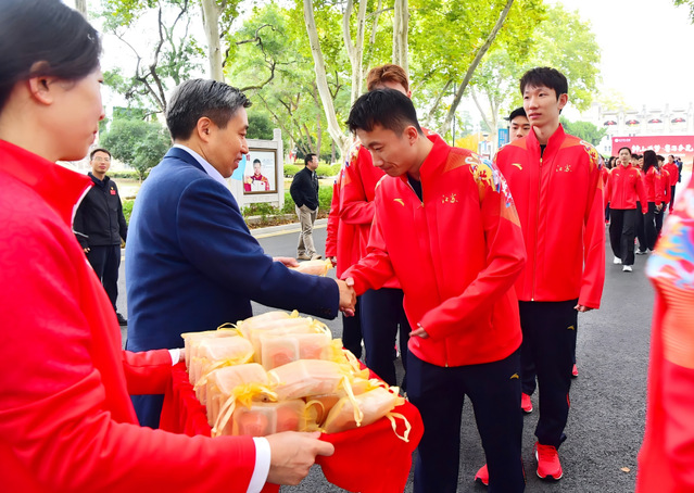 在庄重而热烈的氛围中,校党委书记刘红明与全体出征人员一一握手送别,送上寓意“旗开得胜、马到成功”的“定胜糕”,表达了全校师生员工对羽毛球队的殷切期望,挥手目送满载出征将士的车辆驶出校门。