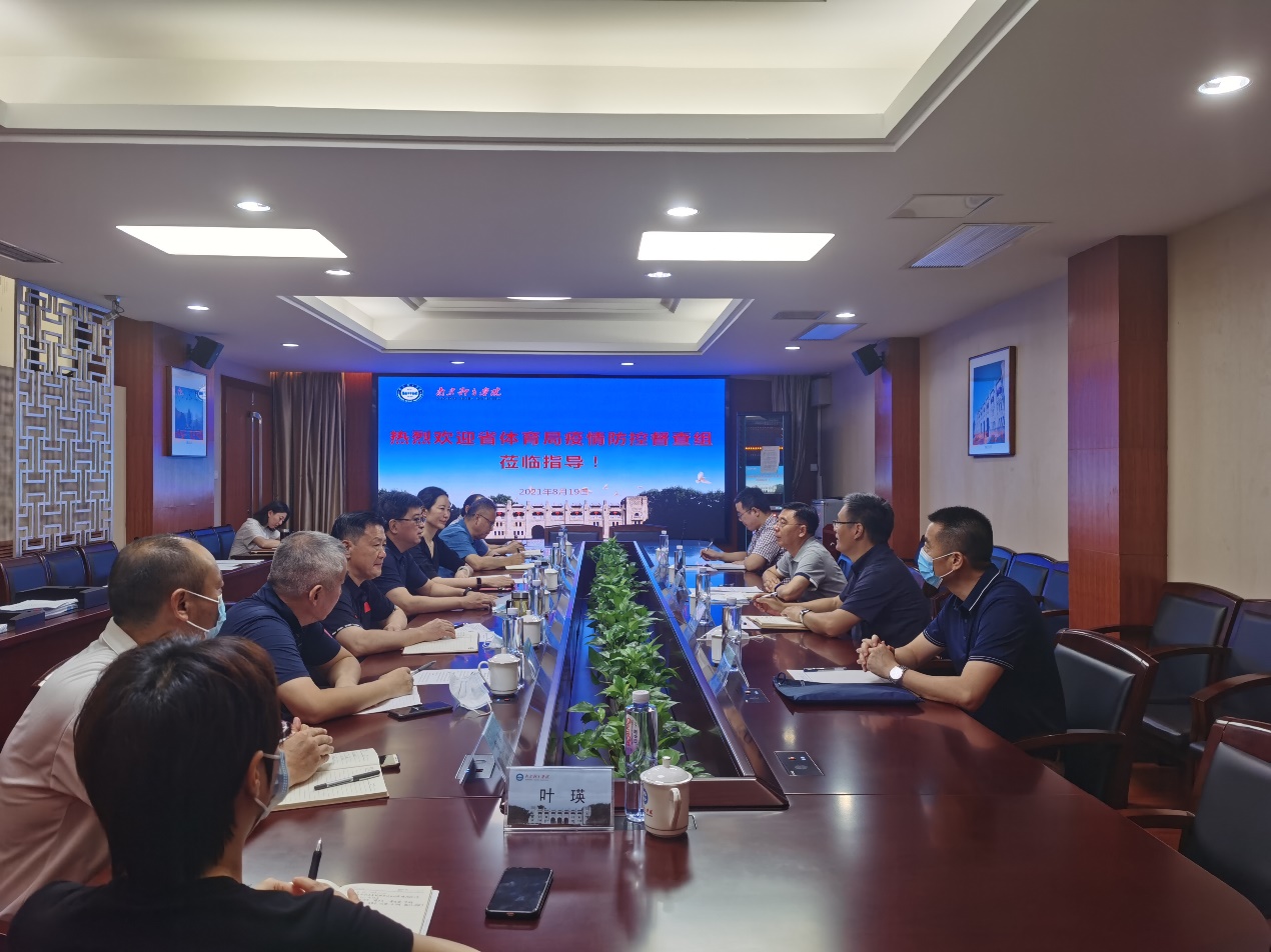 在行政办公楼301会议室,督导组听取了我校十四运涉赛、参赛人员疫情防控工作汇报。校党委副书记、校长杨国庆,校党委常委,副校长金松、肖爱华出席汇报会。党政办、保卫处、后勤处、训练处、运动康复医院负责人参加会议。