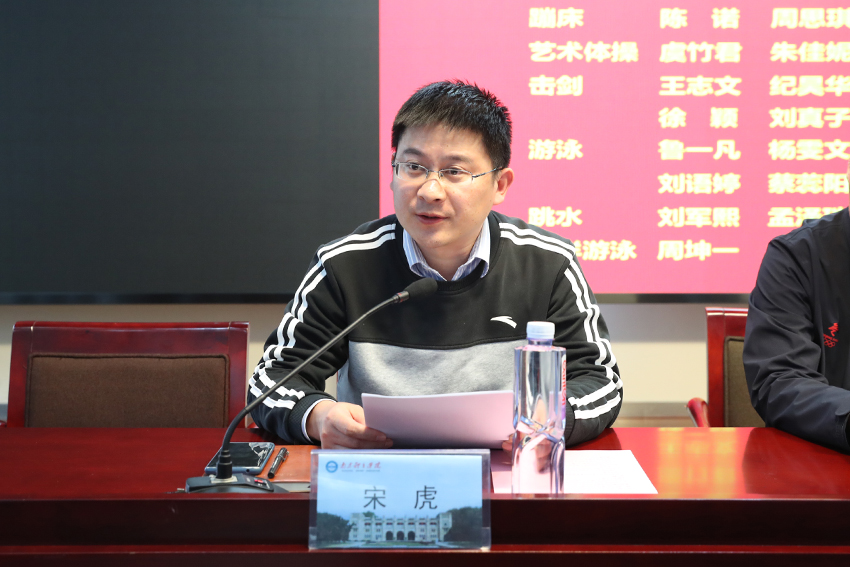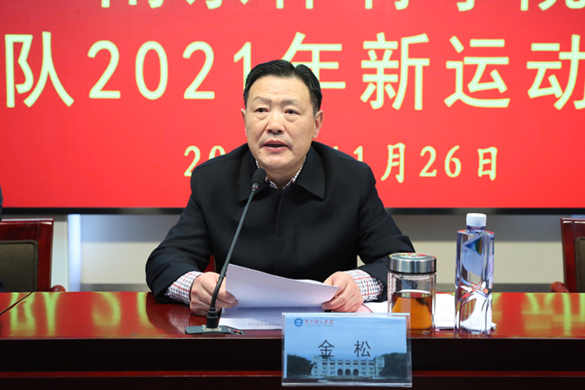 副校长金松代表校党委、校行政向52名新进队运动员表示了热烈的欢迎。他在讲话中充分肯定了这批运动员在试训及测试中的优秀表现,并对他们的未来提出了四点希望。一是坚定信念,从党的百年奋斗历程中汲取前进的力量。要学好党史,深悟思想,以党的精神为引领,树立远大理想,厚植爱国情怀,坚定人生目标,激发前进动力。二是刻苦训练,在学校世界冠军之路上留下自己的足印。要以一名职业运动员的标准和素养要求自己,自觉自律,刻苦专注,做好点滴积累,早日将世界冠军、奥运冠军的梦想变为现实。三是遵章守纪,使奥林匹克精神得以发扬光大。要在训练、比赛、生活中做真正的奥林匹克精神践行者,尤其要把反兴奋剂意识深深植入脑海,为维护奥林匹克的神圣和竞技体育的纯洁贡献应有的力量。四要全面发展,为实现体育强国梦想做出应有的贡献。要争做新时代全面发展的运动员,一手抓好训练任务,一手抓好文化学习,为建设体育强省、体育强国添砖加瓦。