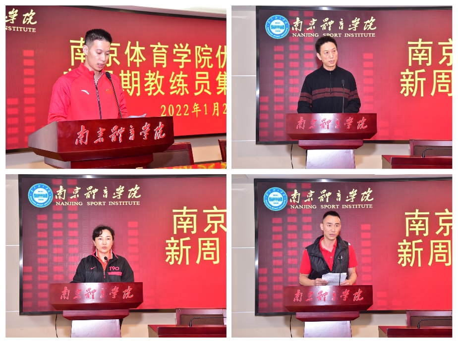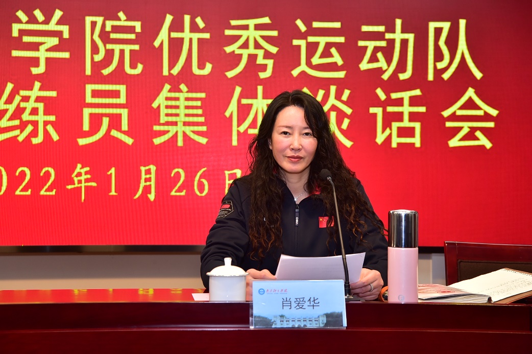第二阶段会议由校党委常委、副校长肖爱华主持。四位教练员代表体操队女子一线主教练周祝麟、网球队男子一线主教练姜惟、跳水队一线主教练徐洁、击剑队女子佩剑一线主教练陈锋分别就分组讨论情况作了交流发言。