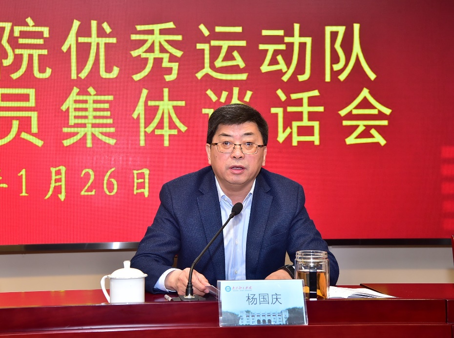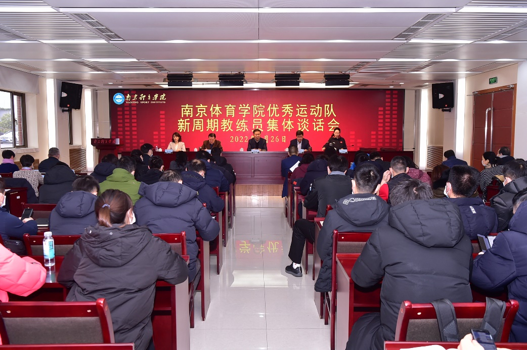 1月26日,我校召开优秀运动队新周期教练员集体谈话会。校党委书记朱传耿,校党委副书记、校长杨国庆,校领导金松、肖爱华、潘林珍出席会议。全体新周期教练员,院、队全体管理干部,训练与管理工作督查组全体成员,人事处负责人,训练处全体人员参加会议。