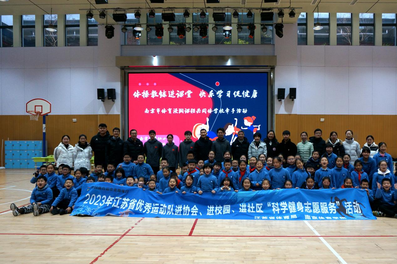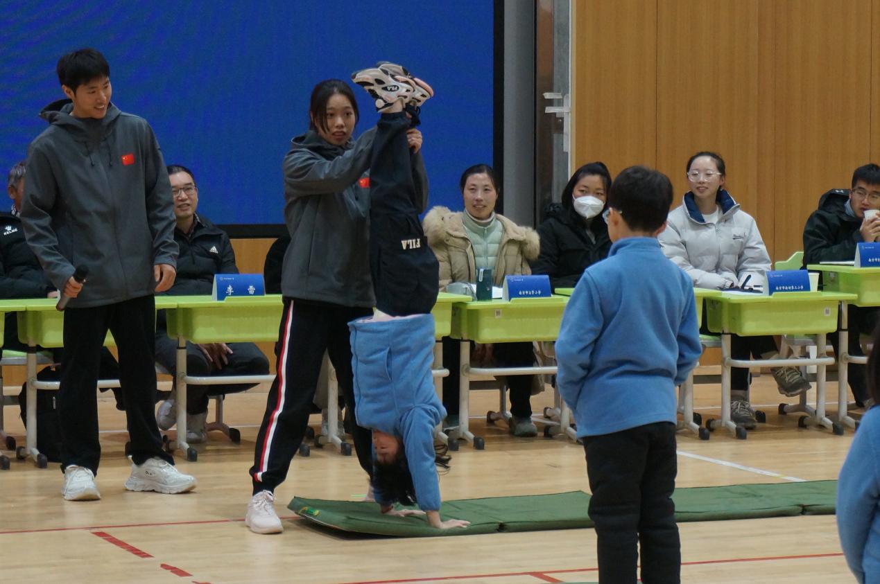 12月14日上午,南京市逸仙小学体育馆内,一群孩子正进行着一节以“好玩的身体数字”为主题的体育课。孩子们充分发挥想象力,通过身体模仿数字,巧妙地将身体与数字结合,达到增强身体各部分柔韧性与灵活性的作用。我校体操队的副领队、教练员孟陈佳与体操全国冠军周琳琳等运动员,带领孩子们从前滚翻动作入手,通过系统的示范与指导,教会孩子们规范的动作要领。不少孩子跃跃欲试,想要在专业运动员的带领下,挑战难度更高的动作,现场不时传来阵阵欢呼。孩子们在活动中进一步体会到了体操运动所带来的独特魅力。