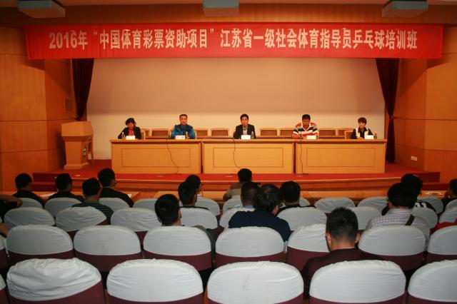2016年“中国体育彩票资助项目”江苏省一级社会体育指导员乒乓球培训班于2016年5月20日 下午2:00在missav图书馆报告厅开班,missav党委书记、院长陈国祥教授、江苏省社会体育指导员协会副秘书长俞加林先生、missav继续教育部主任李勇勤教授、副主任李英副教授、运动系小球教研室丁玲玲副教授及missav继续教育部全体工作人员和来自江苏省13个地级市的一级社会指导员乒乓球培训班全体学员出席了此次开班仪式。